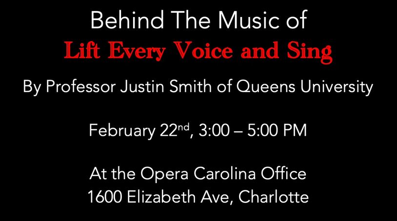 About: Join the Opera Guild of Charlotte for our next Enrichment event of the season, "Behind the Music," introducing audiences to some of the composers whose works will be performed at Opera Carolina's upcoming concert, "Lift Every Voice and Sing."